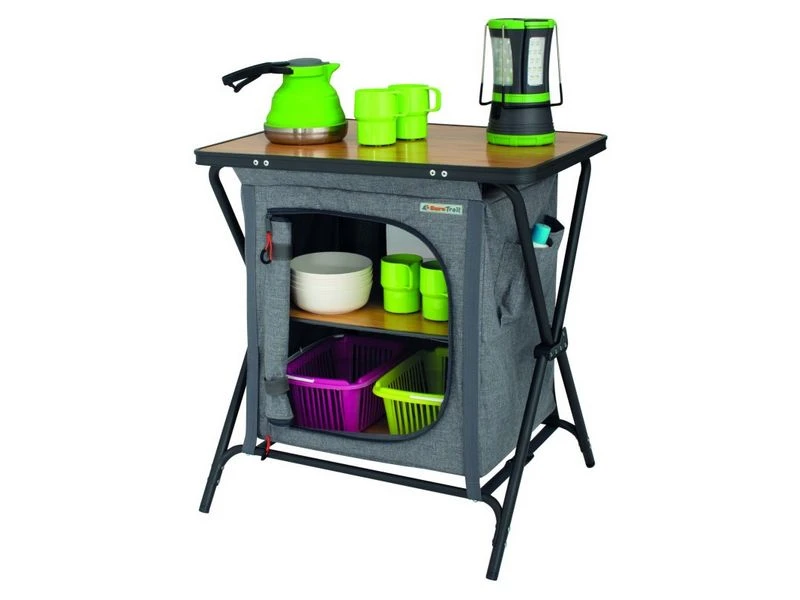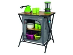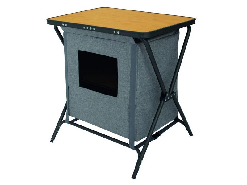 Makkelijk en snel op te zetten lage opklapbare kast. De Nova Venossa is gemaakt van gemêleerd polyester en wordt geleverd met bamboe planken. Voorzien van verstelbare pootjes en inclusief handige opbergtas. Het perfecte formaat om kleine spullen op te bergen en als bijzettafeltje naast je stoel te gebruiken.